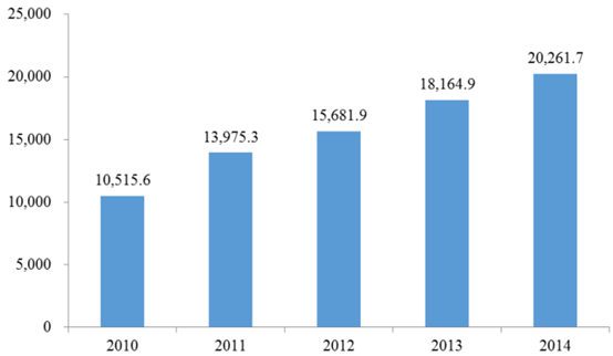 我國食品添加劑行業起步較晚,但發展十分迅速。食品添加劑雖然在食品配料中所占比例較低,但對食品風味、品質提升起著重要的作用。隨著人們生活水平的不斷提高,消費者在追求食品健康、營養、衛生的同時,逐漸尋求口味的時尚與新穎,市場需要更多的新口味來滿足人們愈來愈挑剔的味覺。2010~2014 年,我國食品制造行業銷售收入始終保持穩定增長,年均增長率超過 10%。2014 年國內食品制造行業實現銷售收入 20,261.70 億元,同比增長 11.54%。在食品制造業的穩定發展、消費者多元化需求不斷增加的有利條件下,食品添加劑行業有望持續高速發展。
